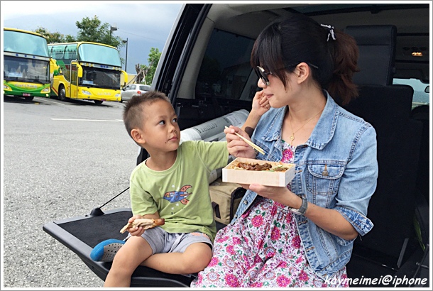 吃到一半下起大雨,大家紛紛撤退到車上繼續吃便當...