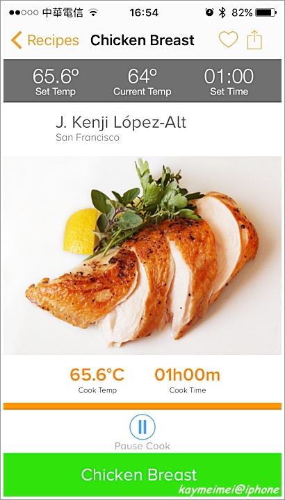 這次直接使用ANOVA APP裡的內建烹調模式,選好雞胸肉之後,按下"開始"就好了!