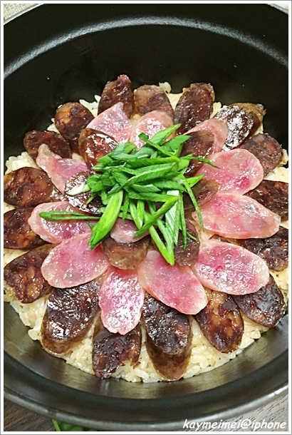 煮飯的同時,臘腸肝腸也被蒸熟了,香氣也都煮到飯裡,白飯拌入醬汁再把切片臘腸排入就好