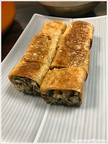 這次的搞工菜是這道腐皮如意卷,裡面有綠竹筍、木耳、紅蘿蔔、綠豆芽、香菇、薑絲、香菜,